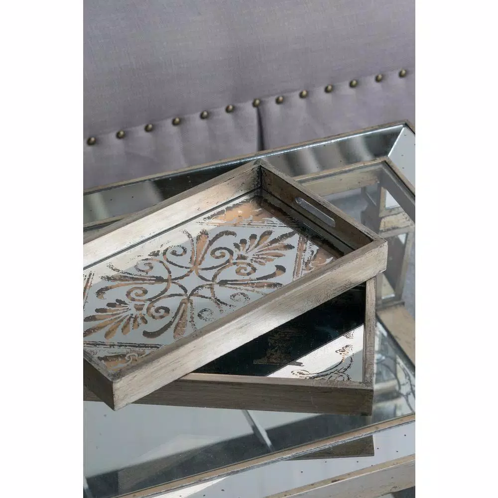 Use this (set of 2) large Greta Rectangular Glass and Wood Trays around the home or at your next gathering for a charmingly worn, elegant look. with a weathered frame, antique glass, and lavish patterns, these coordinating trays offer endless uses around the home. The Greta Trays enable you to serve anything in style – from breakfast in bed to a champagne brunch to a casual backyard gathering.