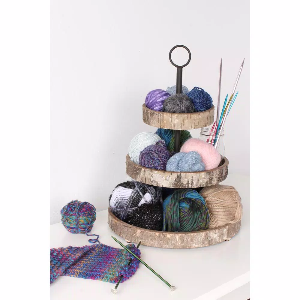Organize your home in rustic chic style with this three tiered white birch tray. This charming tiered tray can be used to create a beautiful decorative centerpiece on your holiday table. The rest of the year this tray can be used on a bathroom counter to organize your beauty accoutrements, or it can be used on a kitchen counter or office desk for organization of your stationary, pens, and electronic devices. The smallest top tray has an 8 in. diameter, the middle tray has a 12 in. diameter, and the largest base tray has a 16 in. diameter. The decorative stacked trays are constructed of solid wood with a real birch bark finish and a metal pillar topped with a convenient carrying loop. The overall dimensions are a 16 in. diameter by 22 in. high. Decorate and organize in rustic chic design in any room of the home with this tiered tray.