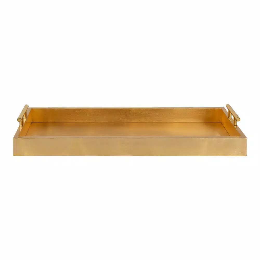 The glamorous style of the Lipton tray collection has been updated for added value with a long sleek shape. This new elongated rectangular tray is as striking as it is useful. Place this sophisticated accessory on your entrance console table as a place for trinkets or to hold your keys and mail as you come and go. Use it as a decorative accent on your coffee table or on your vanity to organize your make up. Constructed of wood with a metallic gold leaf finish and polished metal handles, it is sturdy enough to serve a line of champagne flutes to your poshest guests. The tray has pads on the bottom to protect your furniture surfaces and measures 24 in. long, 10 in. wide and stands 3.25 in. H.