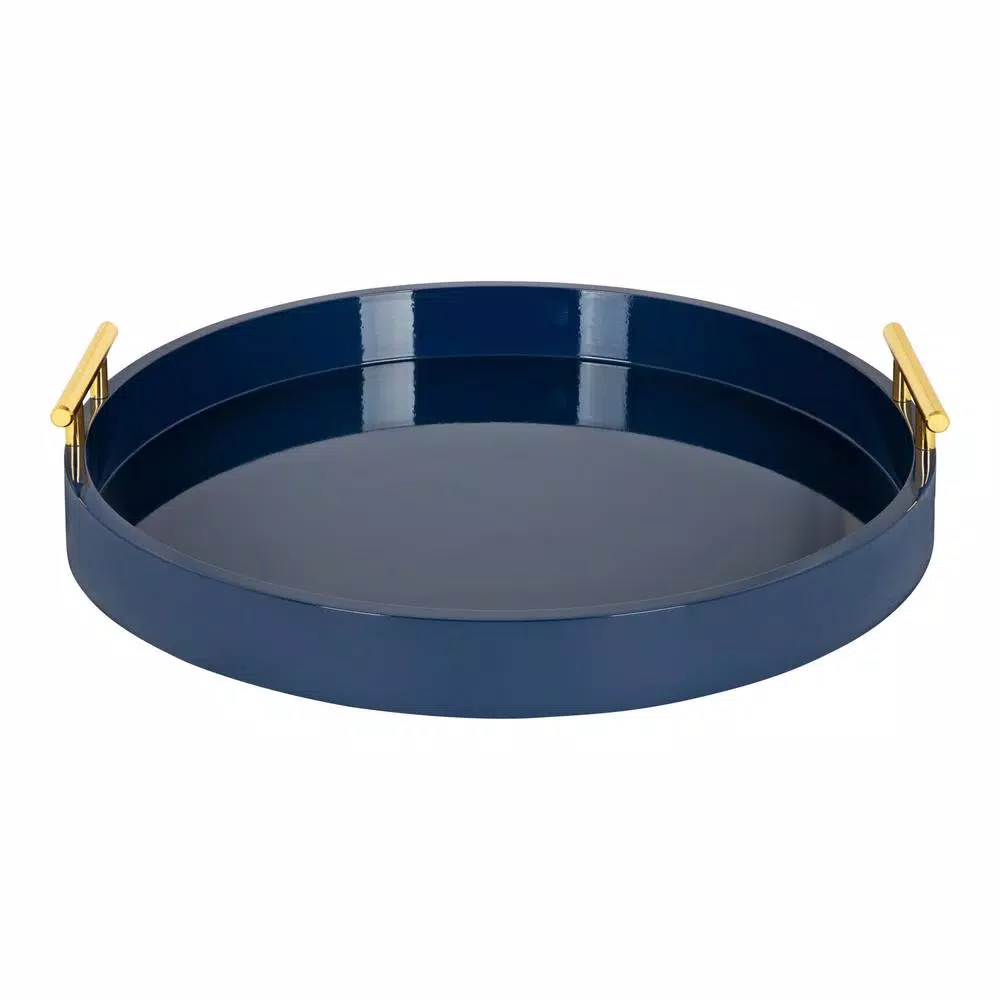 Bring modern glam style into your home with this circular-shaped decorative accent tray with polished metal handles. Place this charming tray on your entrance console table as a trinket tray to hold your keys and mail as you come and go. This round tray is spacious enough to hold documents or file folders on a home office desk. This tray can also be used as a decorative accent on an ottoman to hold your beverages or on your vanity for makeup organization. Constructed of solid manufactured wood with a glossy finish and polished metal handles, this tray is sturdy enough to serve your cocktails. The tray has a 15.5 in. Dia with an inside depth of 1.75 in. Bring a chic and glamorous decorative accent into your home with this beautiful modern tray.