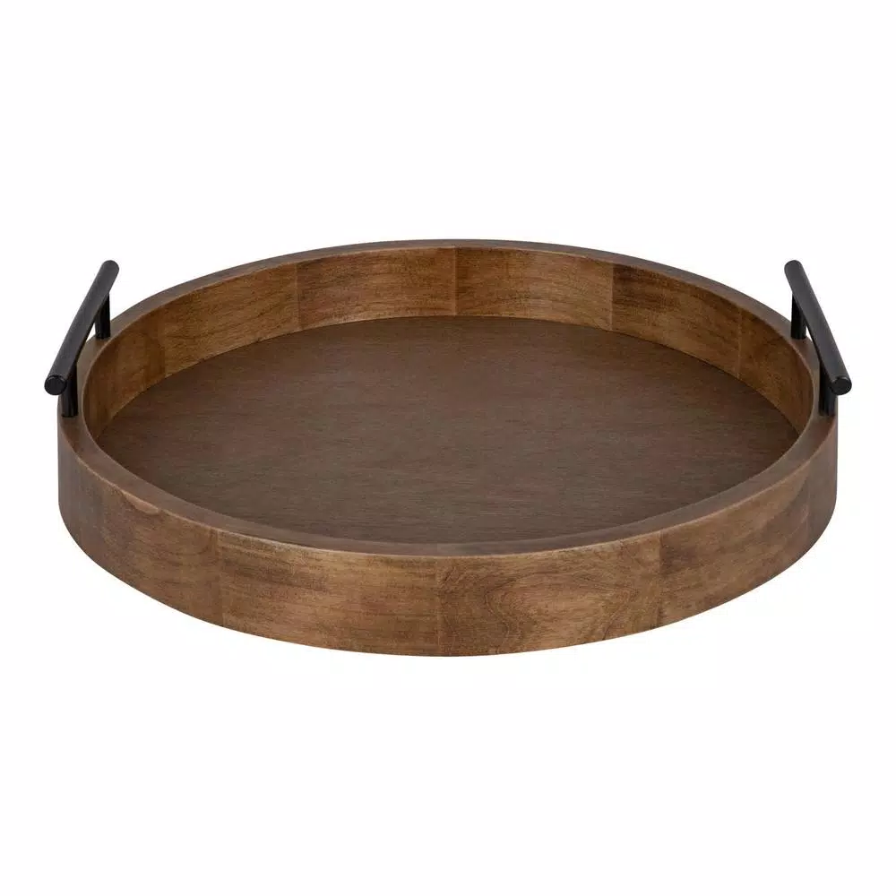 Bring rustic farmhouse style into your home with this circular-shaped decorative accent tray with metal handles. Place this charming tray on your entrance console table as a trinket tray to hold your keys and mail as you come and go. This round tray is spacious enough to hold documents or file folders on a home office desk. It can also be used as a decorative accent on an ottoman to hold your beverages or on your vanity for makeup organization. This tray is constructed of wood with a rustic woodgrain finish and black painted metal handles. The tray has a 15.5 in. Dia with a depth of 1.75 in. Bring a chic and glamorous decorative accent into your home with this beautiful modern tray.