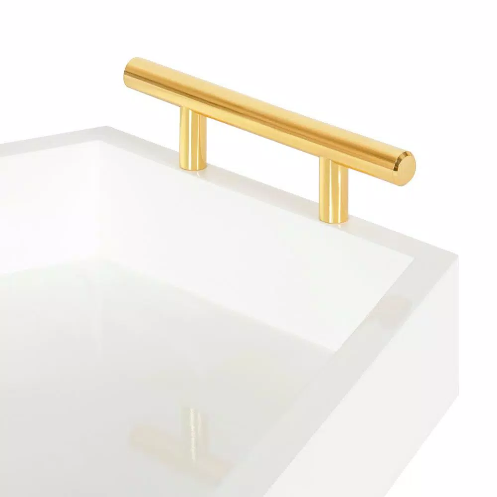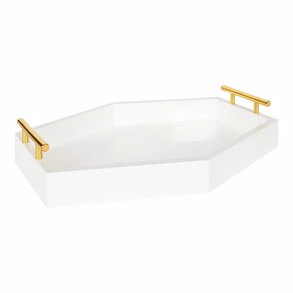The Lipton Trays combine practical storage with decorative elegance in this new shape by Kate and Laurel. Taking inspiration from elegant geometric forms, this beautiful tray has an oblong, hexagon shape, thoughtfully crafted with both storage and display in mind. This edition of the Lipton Tray also has a glossy, chic white finish, with polished gold metal handles for an extra glamorous detail. Use the 16.5 in. wide x 12 in. long size for storage of media remotes, small beverages or decorative plants. It’s not only excellent for your living room, either use it as a decorative centerpiece in your dining room, as a cute catch-all in your entryway, a storage area for your precious art supplies or a large jewelry tray in the bathroom. With the right coasters and small plates, you could even use it as a decadent serving surface for charcuterie and cocktails. This tray comes fully assembled right out of the box, so it is ready to use as soon as it arrives.