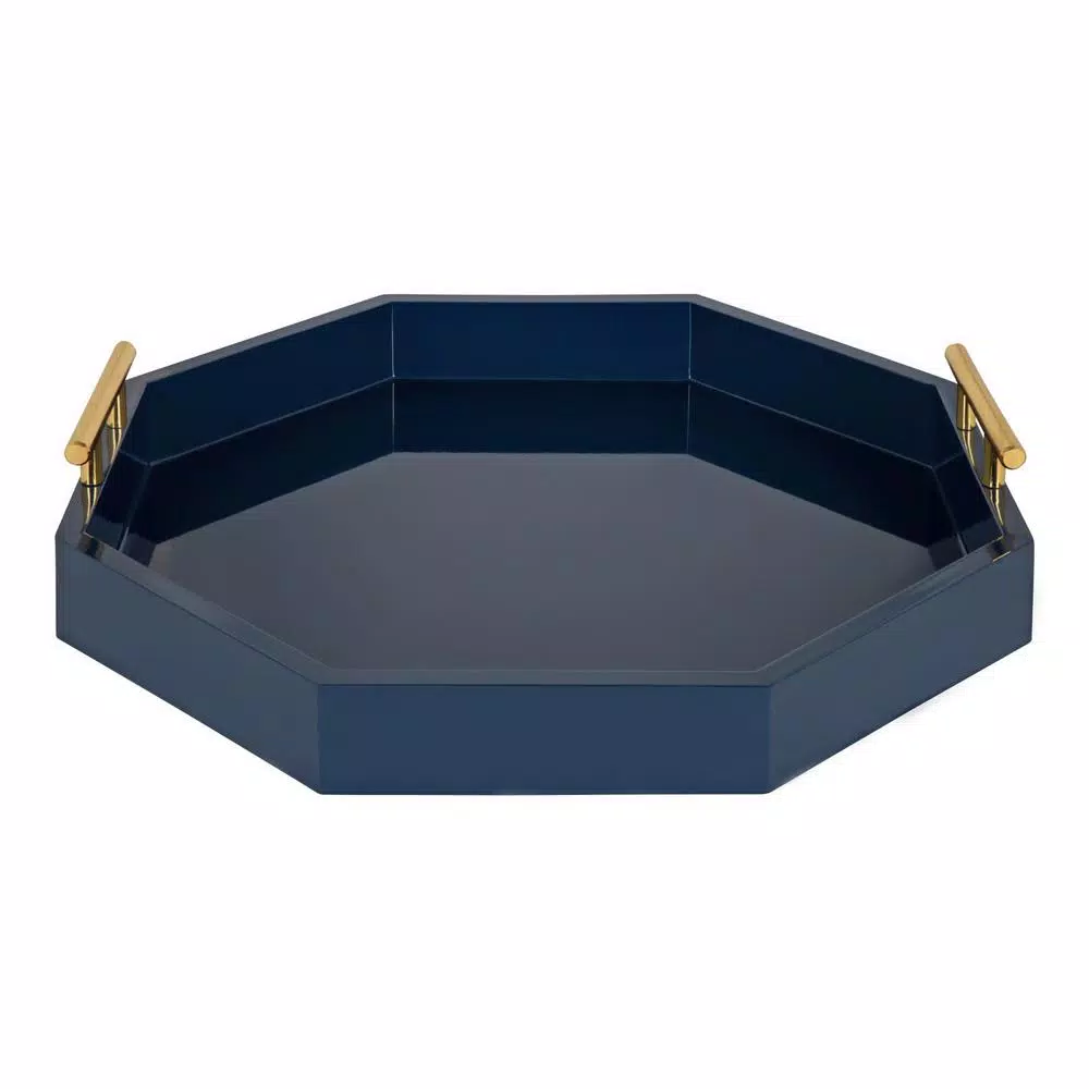 Bring modern glam style into your home with this octagon-shaped decorative accent tray with polished metal handles. Place this charming tray on your entrance console table as a trinket tray to hold your keys and mail as you come and go. This octagon tray is spacious enough to hold documents or file folders on a home office desk. This tray can also be used as a decorative accent on an ottoman to hold your beverages or on your vanity for makeup organization. Constructed of solid MDF with a glossy finish and polished metal handles, this tray is sturdy enough to serve your cocktails. The tray measures 18 in. wide x 18 in. deep and stands 3.25 in. H. Bring a chic and glamorous decorative accent into your home with this beautiful modern tray.