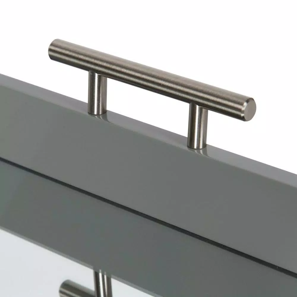 - Decorative tray is constructed of sturdy MDF with glossy finish, a mirror base, and polished metal handles