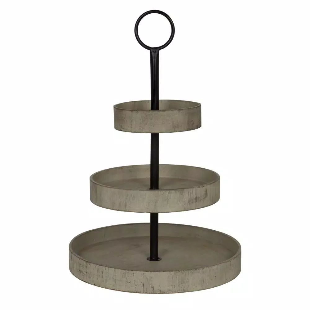 Organize your home in rustic farmhouse style with this three tiered solid wood tray. This charming tiered tray can be used to create a beautiful decorative centerpiece on your holiday table or any time of year. This tray can be used on a bathroom counter to organize your beauty accouterments, or it can be used on a kitchen counter or office desk for organization for your stationary, pens, and electronic devices. The smallest top tray has an 8 in. Dia, the middle tray has a 12 in. Dia, and the largest base tray has a 16 in. Dia. There is 6 in. of height between each tray. The decorative stacked trays are constructed of solid wood with a metal pillar topped with a convenient carrying loop. The overall dimensions are a 16 in. Dia by 24 in. high. This tray is easy to assemble and requires no extra hardware. Decorate and organize in rustic chic design in any room of the home with this lovely tiered tray.