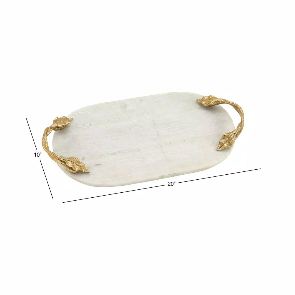 This decorative tray is designed with a simple oval marble slab body with 2-aluminum end handles, offering stylish display and storage options for homes and spaces. The leaf and vine design of this tray’s aluminum handles add a nature-inspired look. The white marble and gold iron finishes of this oval tray bring classic elegance to interior design settings.