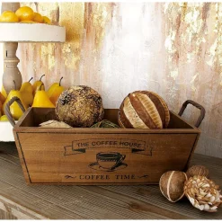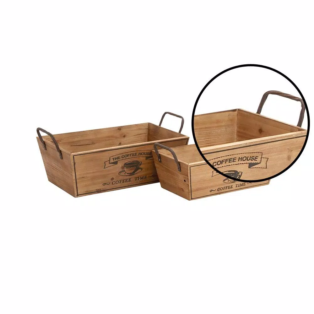 - Set of two 19″ and 16″ Farmhouse “Coffee Time” wood and iron rectangular wine trays, natural pine finish solid bottoms and deep sides with exterior black typography and border, twisted tarnished iron gray-finish wire handles
