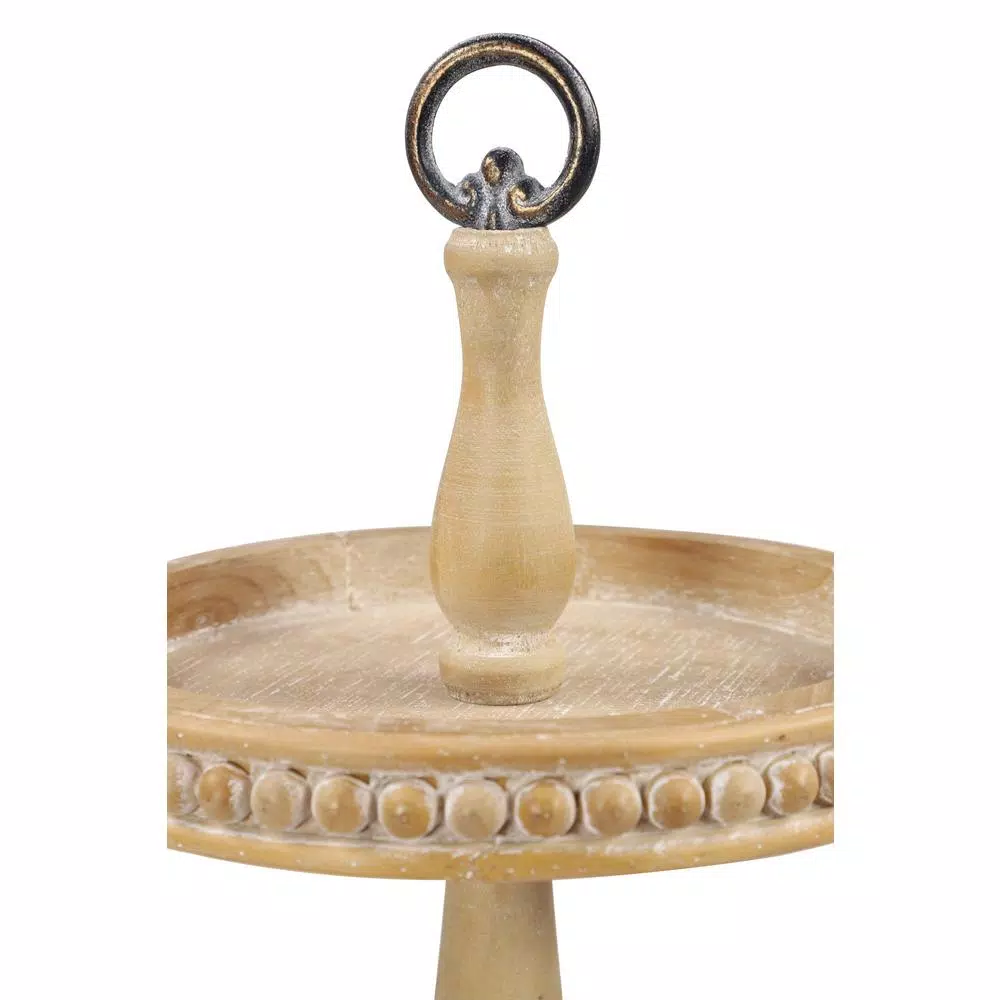 - 3-Tier tray with decorative wood beads and a whitewash finish over the light beige birch wood and MDF wood circular trays and turned center posts; distressed, dark silver iron ring with antique-style decoration at the top for carrying
