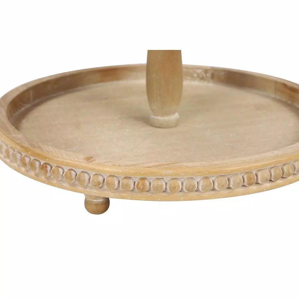 Natural light beige birch wood forms this tall, 3-tier tray stand with round wood serving trays. The textural birch wood with whitewash finish adds an earthy, natural touch while the decorative wood bead trim and feet add a simple, relaxed style element. The top has a decorative, textured silver iron ring for easy carrying and a hint of vintage style.