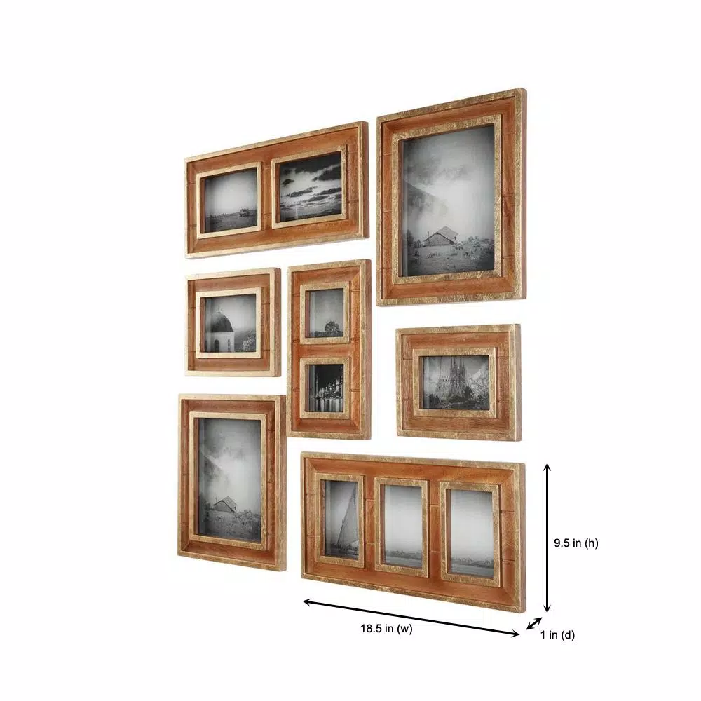 Display your favorite memories innovatively with the Natural Wood and Gold Gallery Wall Picture Frames (Set of 7) from Home Decorators Collection. These frames are made of walnut brown wood with a decorative gold trim that creates an elevated visual appeal. Each frame has a protective glass facing that can be cleaned easily using a soft, dry cloth. With sawtooth hooks on the back, these frames can be easily hung vertically or horizontally according to your preference. Their decorative design makes them an ideal gifting option for your loved ones on special occasions.