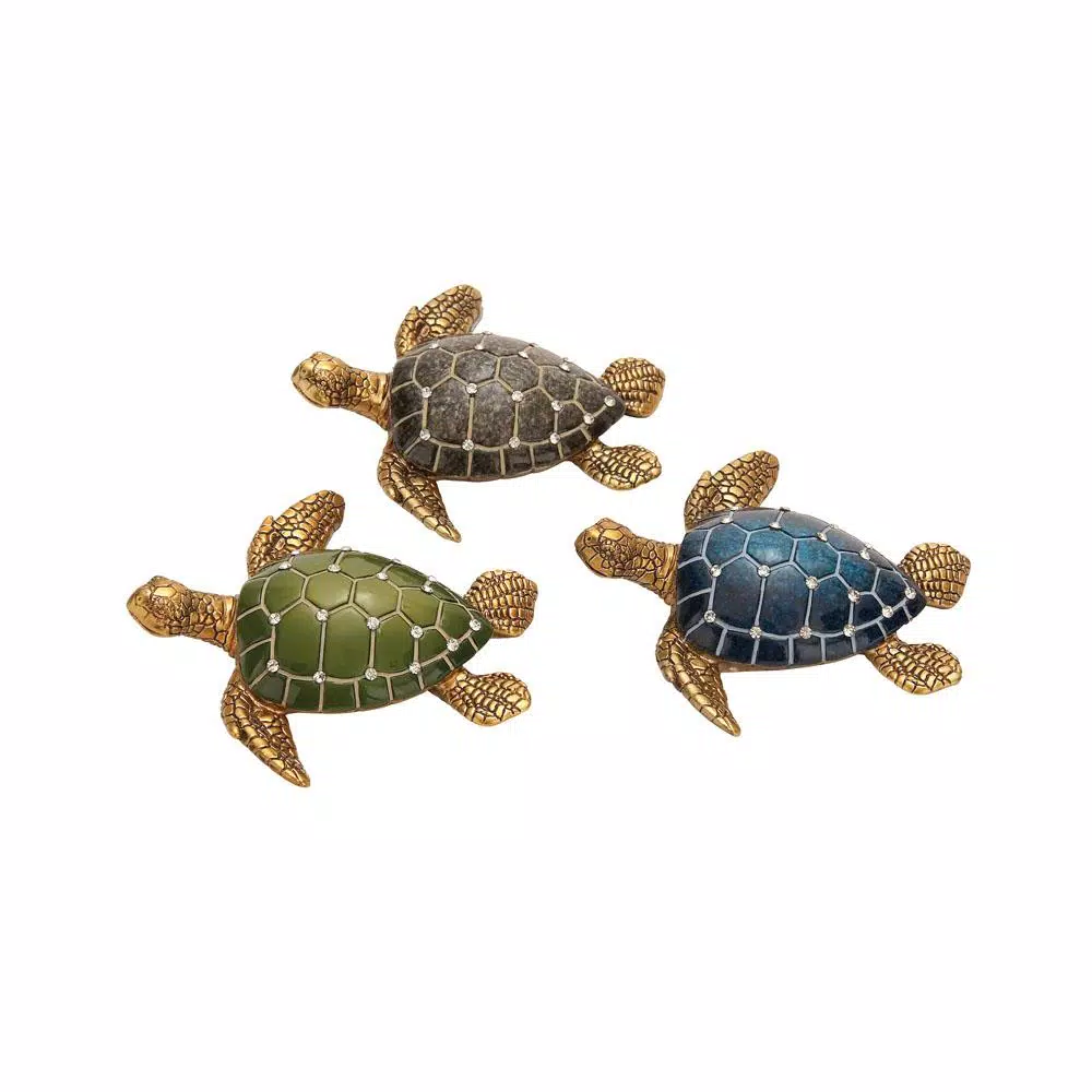 This set of 3 sea turtle decorative sculptures features 3 sea turtle polystone figures with shield-shaped shells and detailed heads and flippers, adding a quirky animal-inspired touch to interior design settings. The polished polystone finish of these decorative sea turtle sculptures provides a sleek and elegant look. The sea turtle shells come in vibrant tropical brown, sea green, and turquoise colors with beige segment lines and clear acrylic stud details that add a lively detail to coastal-living-inspired homes and spaces.