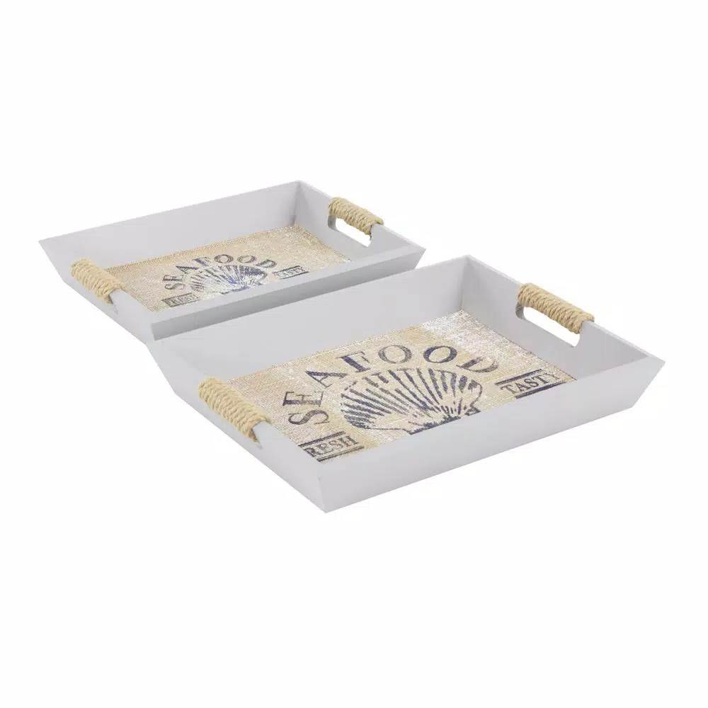 - Set of Two 13″, 15″ Coastal Living wood tray, two wooden trays with white smoothed MDF finish, features light brown interior accent with gray sea shell print, blue “SEAFOOD FRESH TASTY” text details, light brown ropes tied on each handle