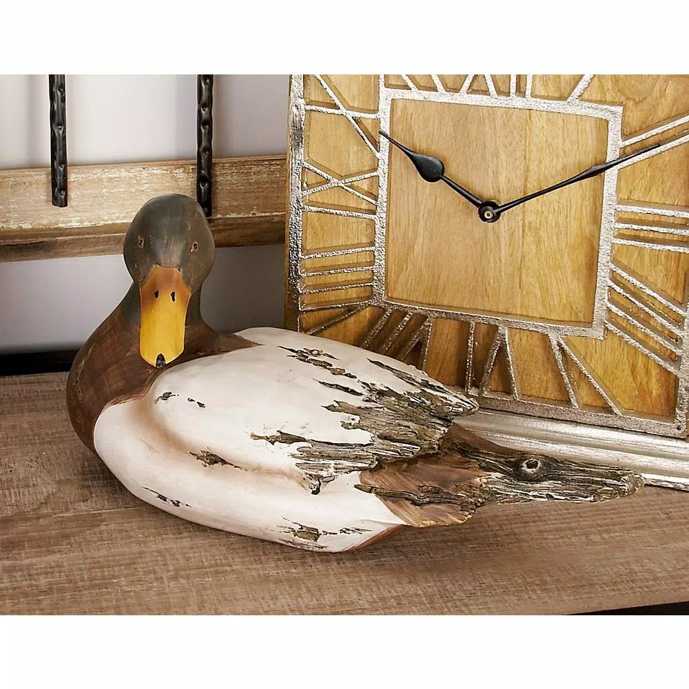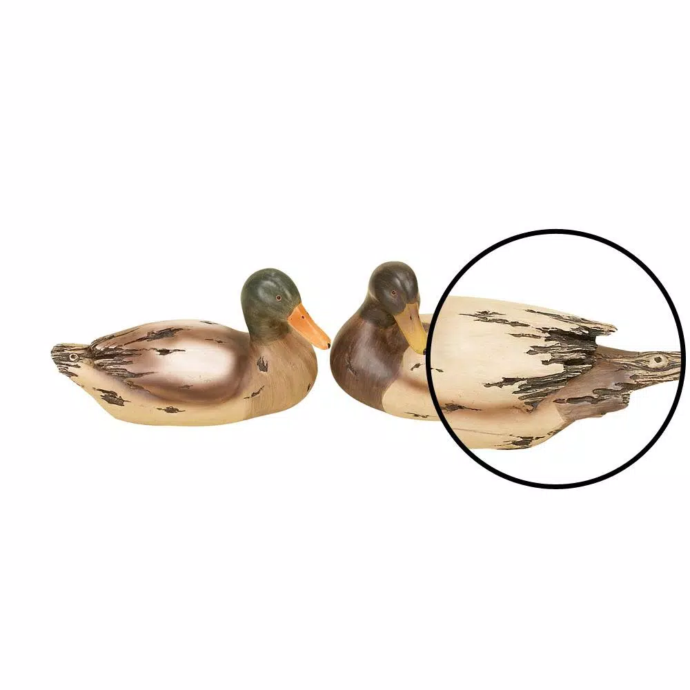 - Set of two 14″ Amazing Animals rustic polystone decoy ducks, polished wood stain-finish polystone with cut-away exposed mahogany brown wood tails and body highlights, forest green headed duck with oak-finish chest, rose gold-finish wings and tan body, chocolate brown headed duck with mahogany brown neck, tan body and wings, gradated orange bills, black eyes