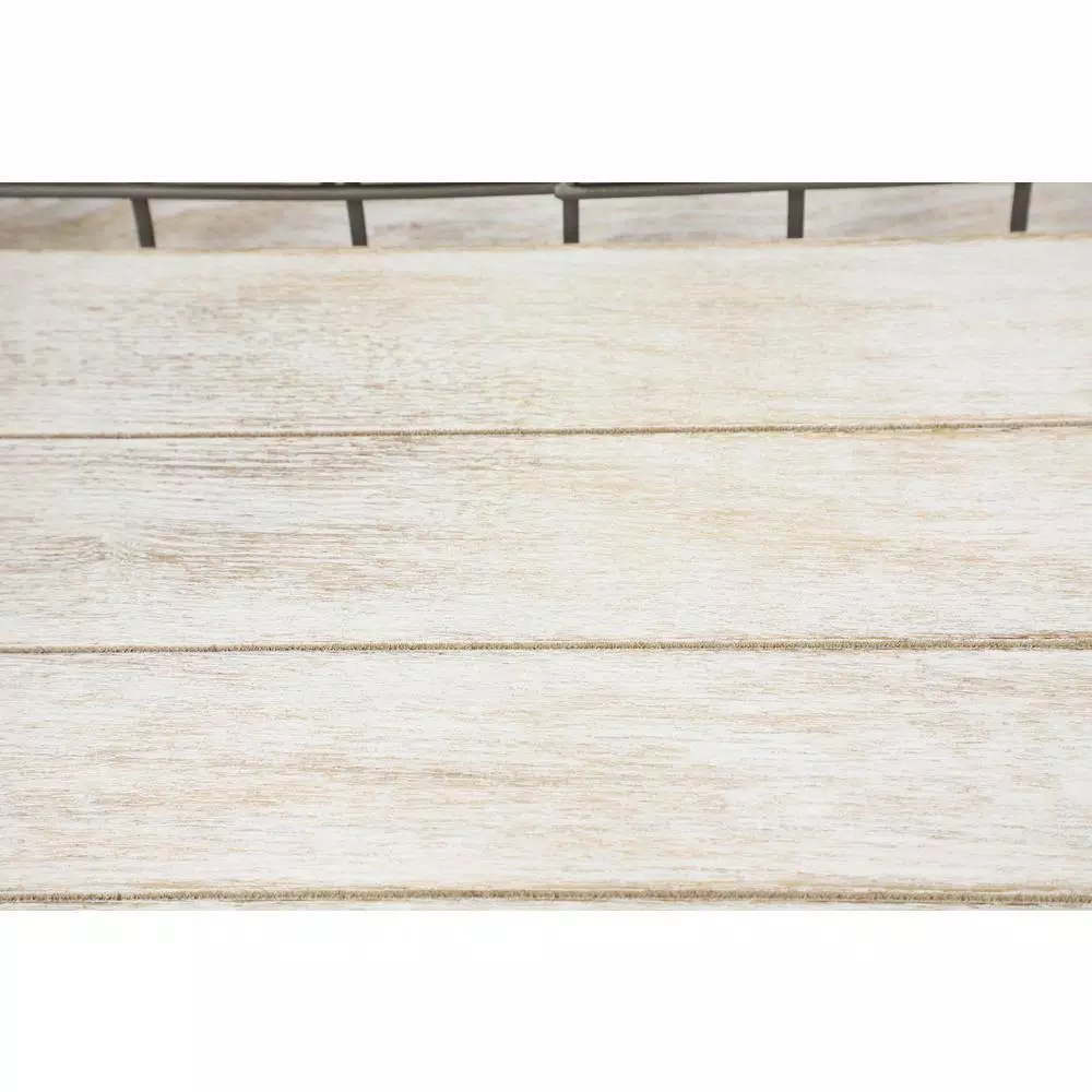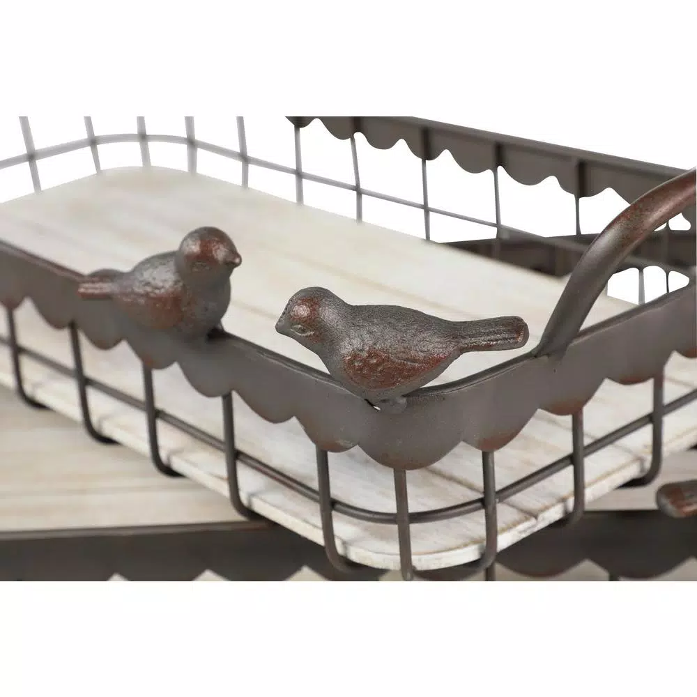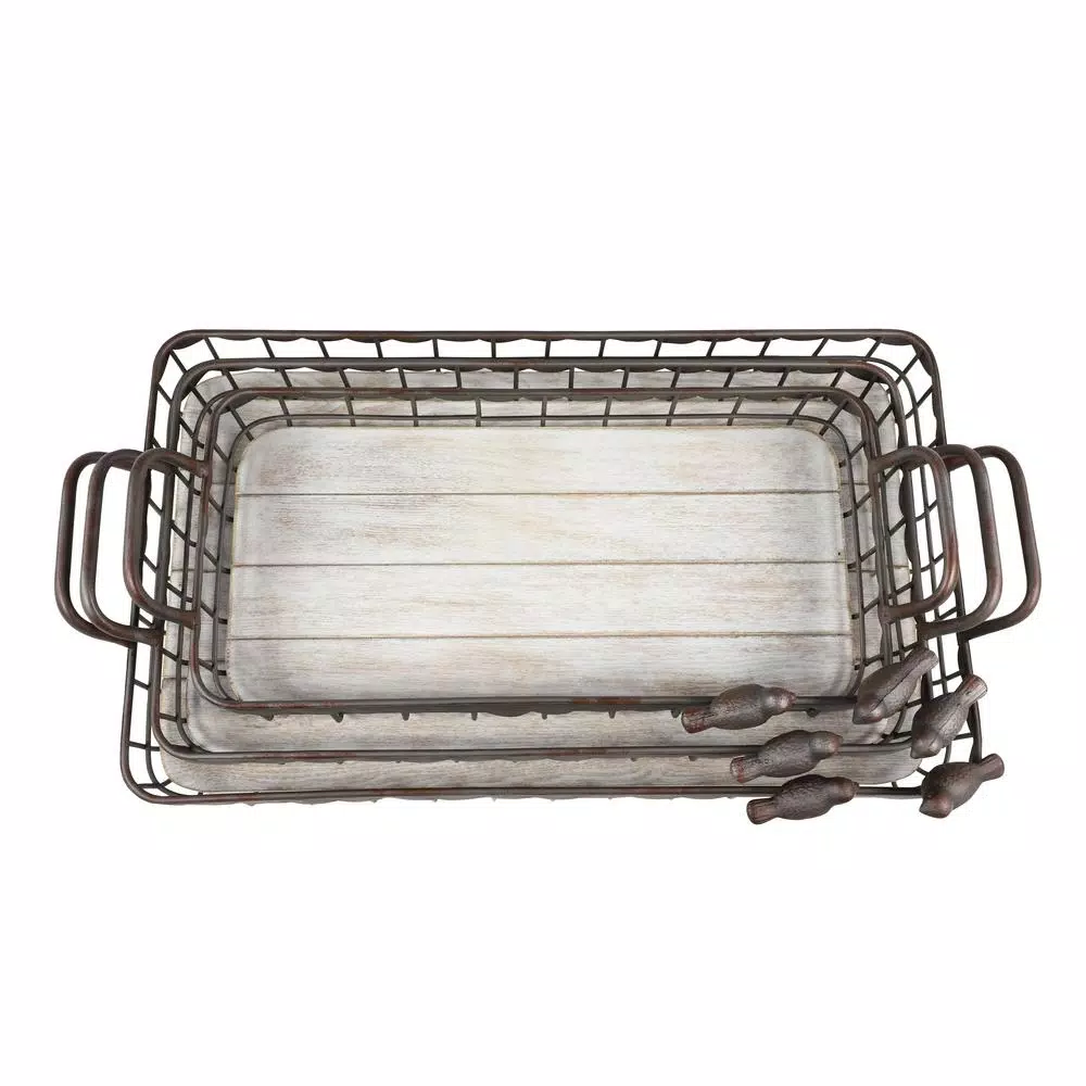 Add this set of 3 large, rectangular, matte cocoa brown metal serving trays with bird figurines for a rustic touch to your farmhouse or vintage-themed home… A subtle decorative rust finish gives an antiquated texture to these decorative trays, as well as 2 life-sized metal bird decor figurines perched in the corner of each basket. The trays are completely metal featuring a scalloped border along the top, and an open cage design, measuring 14″ x 27″, 12″ x 25″, 9″ x 22″, each 3” inches deep. These basket trays are easy to carry with their large smooth, rounded rectangular handles jutting out 2” from the frame. The inside base of each tray is covered in a beautiful whitewashed wood securely screwed into the bottom metal frame, providing a flat, hard surface to carry or display your goods and wares.Set of 3 Farmhouse 22″, 25″, and 27″ wood and iron trays, crafted from MDF and iron, features rectangular, basket-style trays in a distressed iron finish, comes with whitewashed, wooden panels, side handles, and designed with two, distress-finished iron birds