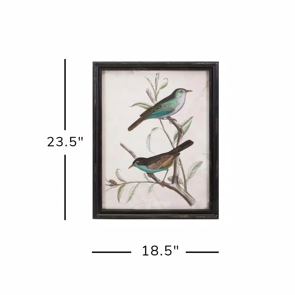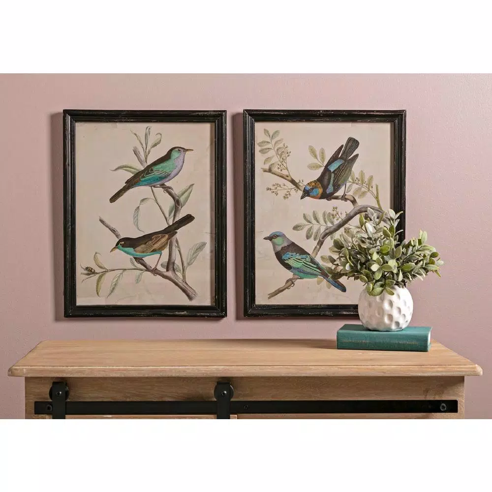 This pair of framed bird prints in blue and brown will add flair to your at-home retreat. Set of two. Great design updates the feel and tone of any room. Conveys artisan skill and quality craftsmanship. Makes a perfect addition to the curated home.