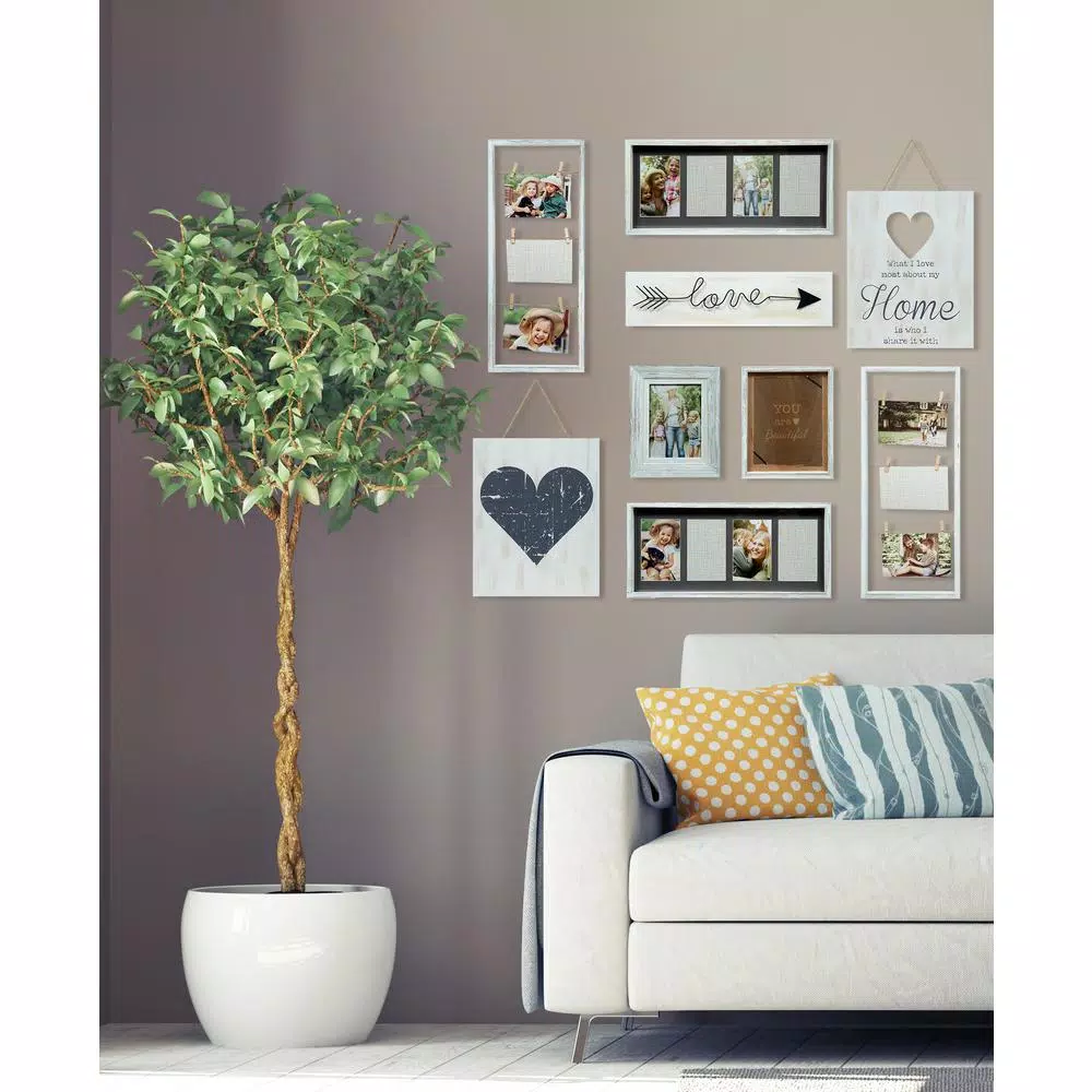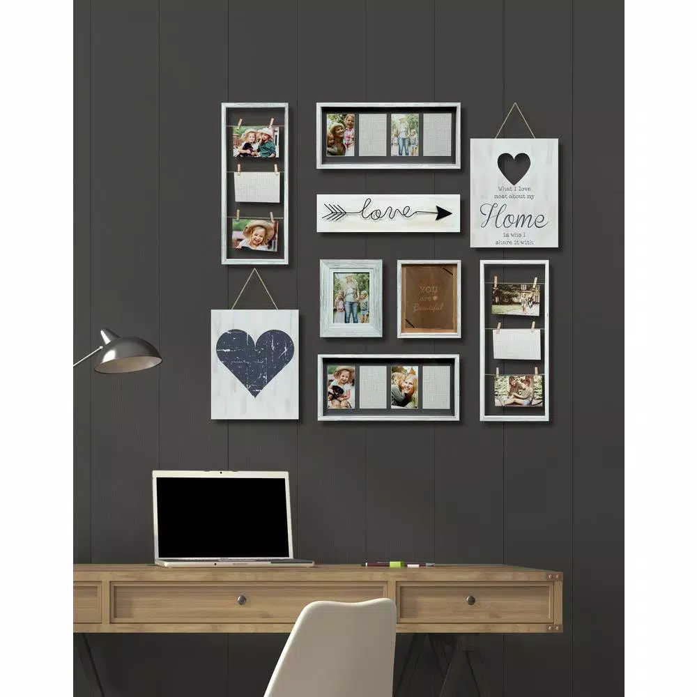 Display your cherished photos with this Gallery Perfect 9 PC Heart Decor Frame Kit. This kit features 9 decor pieces that will allow you to configure your own in-home art gallery in whatever design suits your space best. It includes two 18 in. x 8 in. that mat to four 4 in. x 6 in., two 8 in. x 20 in. clip frames that hold three 6 in. x 4 in., two 12 in. x 15 in. Sentiment frames, one 8 in. x 10 in. Sentiment frame, one 5 in. x 7 in. frame, and an 18 in. x 4 in. Sentiment frame with the word “LOVE” written in metal, with an attached arrow. Turn your Pinterest board into a gorgeous photo wall gallery. Take all the special moments you’ve captured and create a dynamic wall display. Be inspired. Gallery Solution will help you arrange a beautiful wall gallery to show off your photos or favorite art prints.