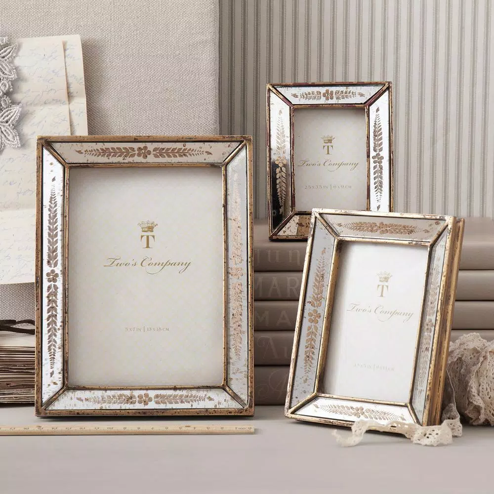 Special memories are given a shimmering gold border with this (set of 3) frames. Each is crafted from glass and resin with a special antique mirroring affect. The set includes a 2 1/2 in. x 3 1/2 in., 3 1/2 in. x 5 in. and 5 in. x 7 in. frame. These lovely frames would make a great Wedding, Housewarming or Anniversary Gift.