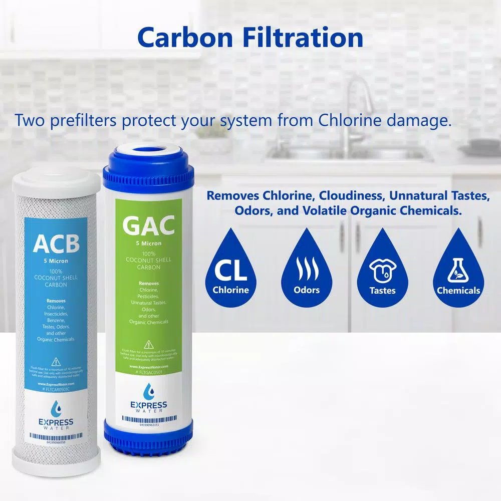 - Pre-Carbon Filter: Activated Carbon Block and Granular Activated Carbon block water filters protect your system from chlorine damage and remove volatile organic chemicals.