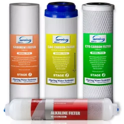 - Includes 1x FP15 sediment filter, 1x FG15 GAC filter, 1x CTO carbon filter, and 1x FA15 alkaline remineralization filter