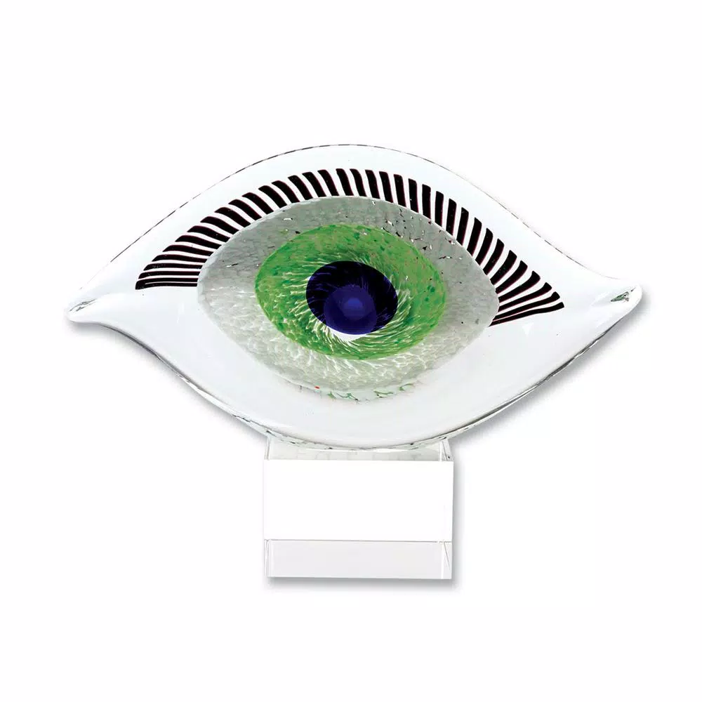 Hers Looking At You Kid! This 7.5β³ Tall 10β³ Wide Crystal Eye Is A Real Looker. A symbol of good luck in many cultures, she is just plain beautiful and unique in our eyes. She Is set on an elegant clear crystal base. Can you think of a better gift for the eye professional in your life? Art glass is a blend of many colors of glass and it is completely normal to have air bubbles appear in the glass. Colors may also vary slightly from piece to piece making each one a unique work of art.
