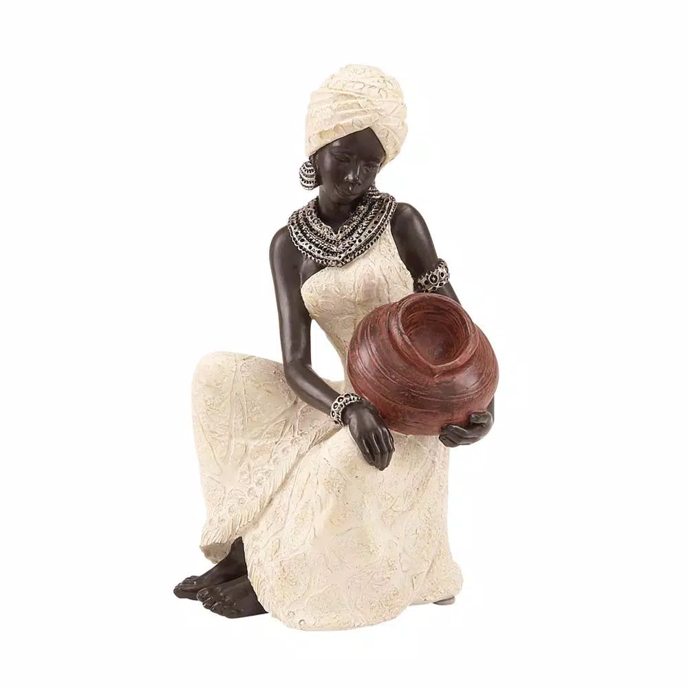 - 6″ X 10″ Globe Trotter rustic African woman sculpture, ebony skinned kneeling woman with beige dress and headdress, silver-finish necklace, bracelet and armband, holding brick red round pot