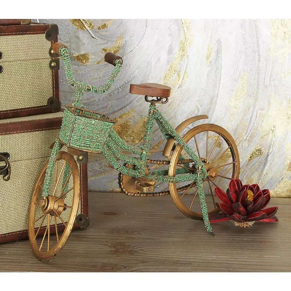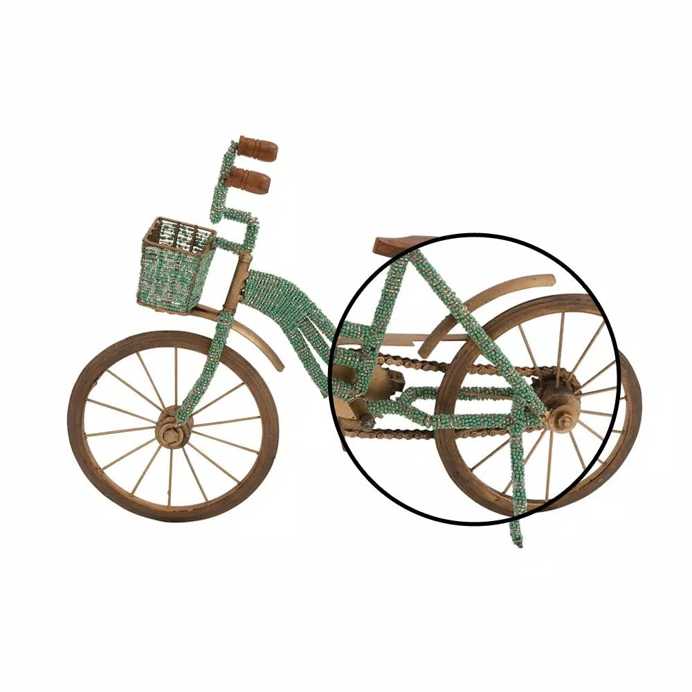 - 18″ Vintage Reflections rustic iron beaded model bicycle, muddy-finish gold iron frame, fenders, spoked wheels, chain and front basket, small green and silver bead wrap around frame, handlebar, fork, basket and kickstand, oak-finish seat and handlebar grips