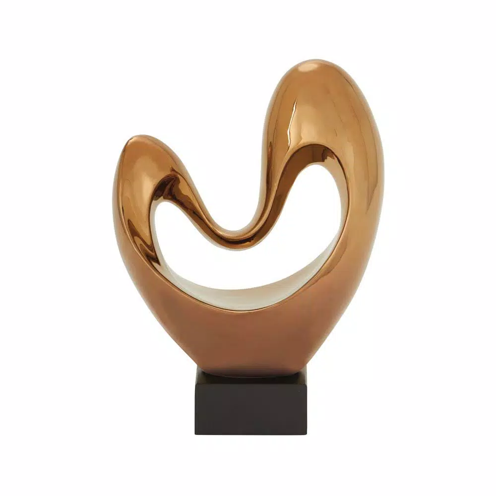 14″ Modern Reflections ceramic abstract heart-shape sculpture, polished copper finish porcelain, black square base