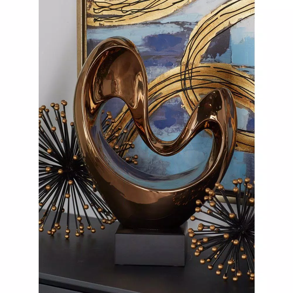 - Metallic copper sculpture with a smooth, swirling, abstract body