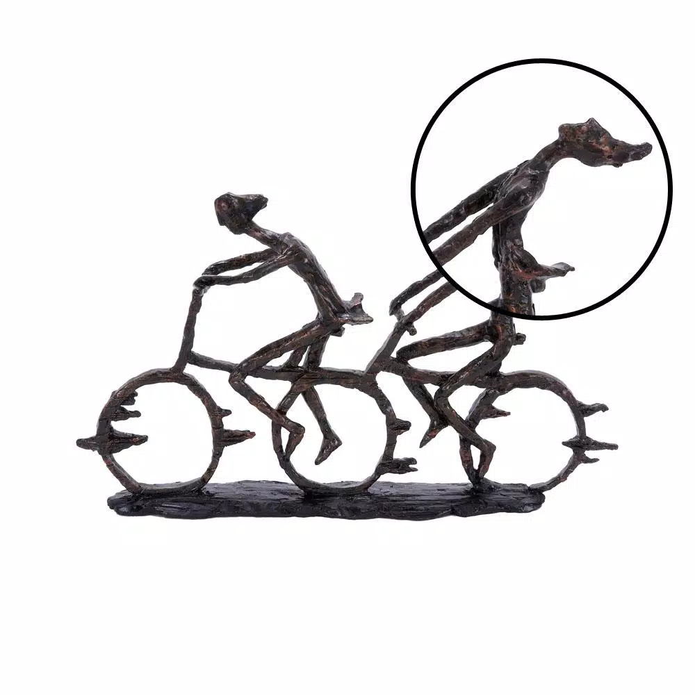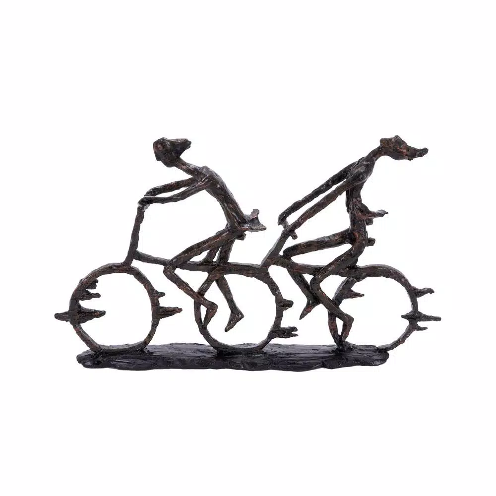 This abstract cycling pair decorative sculpture features stylized cyclist figures riding 2 overlapping bicycle figures, with one rider leaning forward and the other leaning back, adding a fun and lively detail to new traditional homes and spaces. This sculpture’s flat oval-shaped base provides stability. The distressed brown finish of this cycling pair sculpture provides a textured look that enhances its whimsical appeal.