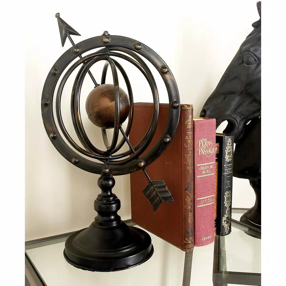 - Metal globe armillary stand with a metal arrow; black and brushed bronze finish throughout
