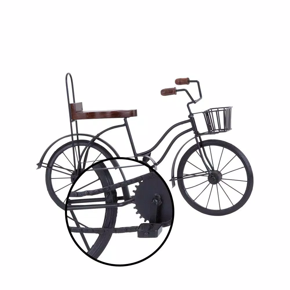 This bicycle model decor features a bicycle figure with an iron frame, a black bike chain, a front basket, fenders, a kickstand, spoked wheels and a mango wood seat and handlebars, a quirky design that adds vibrancy to homes and spaces. This bicycle’s black iron and oak brown finishes give it a rough and rugged look. The classic design of this bicycle model brings vintage vibes to interior design settings.