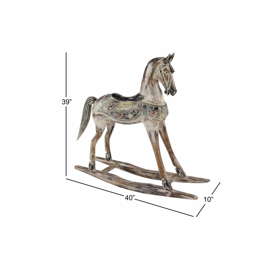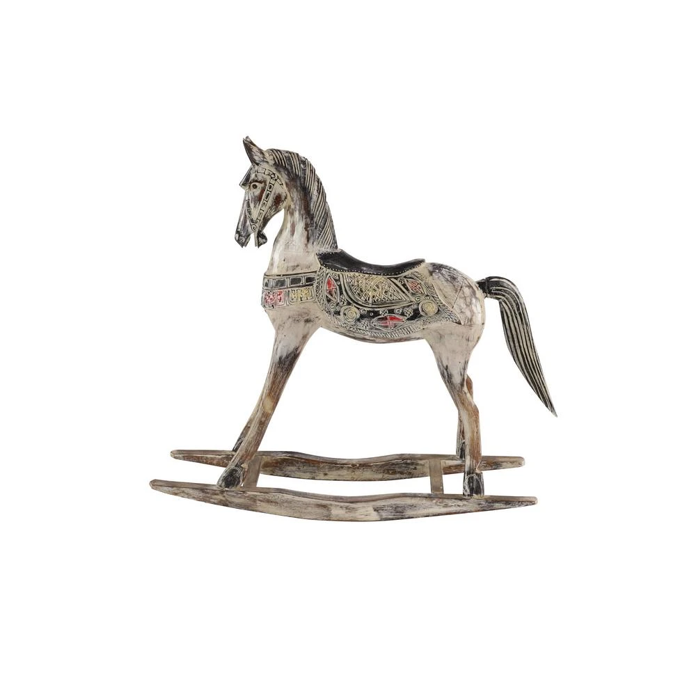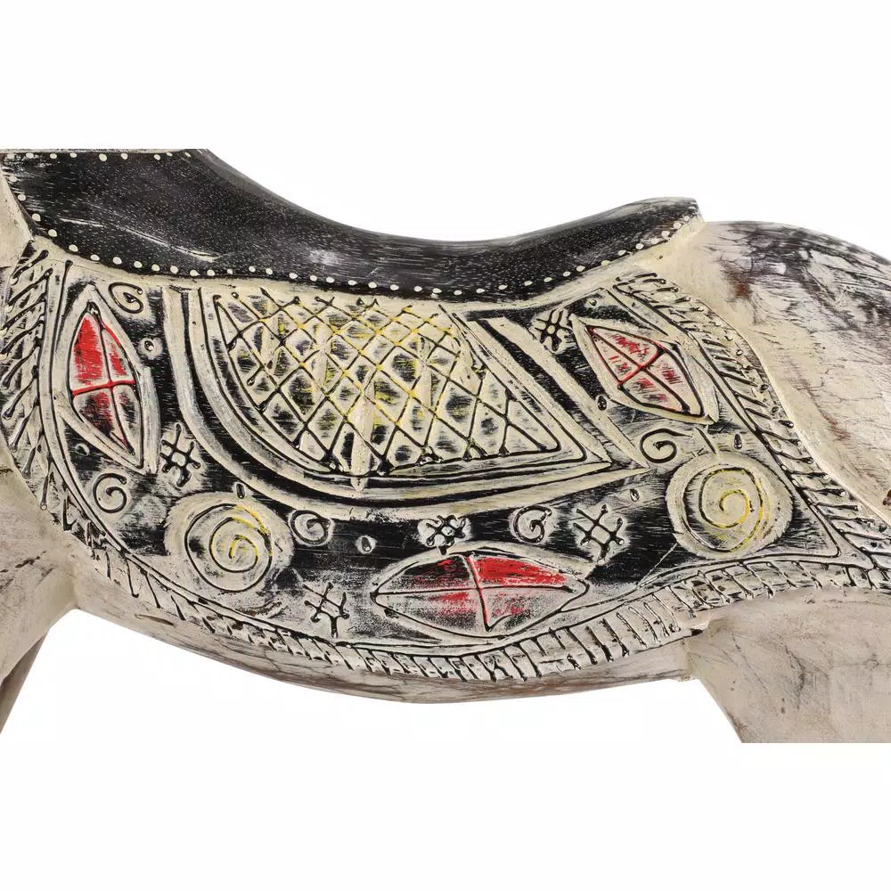 - Hand-carved details throughout the horses face, mane, and decorative saddle with splashes of red, yellow, and black over the beigey whitewash finish fabricate heavy dimension, bringing this decorative horse to life