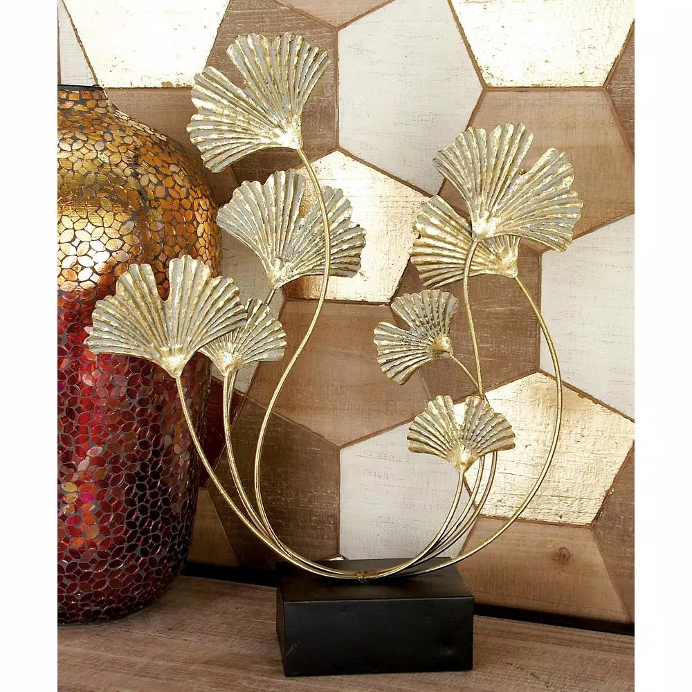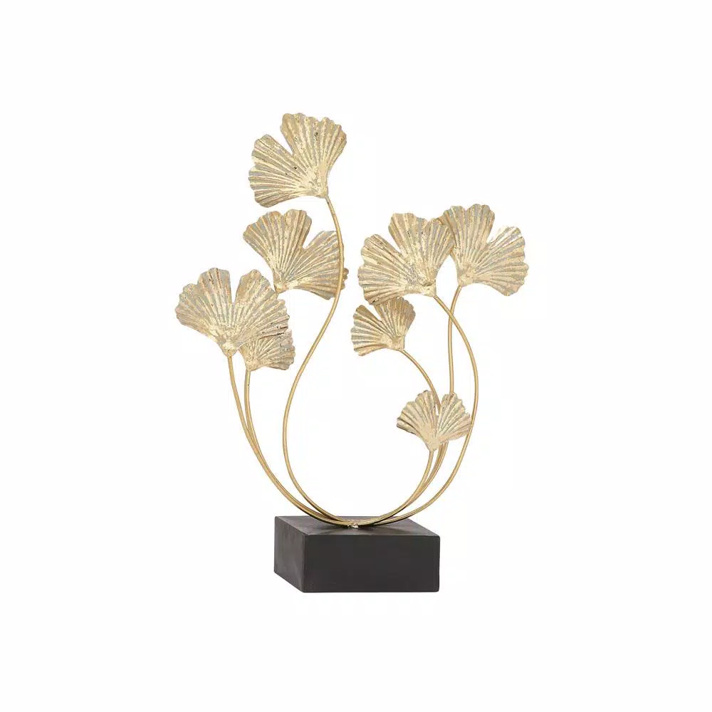 - 22″ Natural Reflections rustic iron ginkgo leaf sculpture, distressed gold finish, fanned and split leaves on connected curled stems, square black block base
