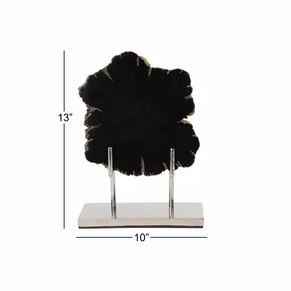 Put the natural beauty of earth’s riches on display with this petrified wood fossil stone accent piece… Exquisite from any angle, all 360 degrees of this large wood slice are visible, flaunting every natural groove, line, and ridge in the live edge wood bark and the blackish-brown interior of the glossy, fossilized petrified wood. Each wood slice is very heavy, like marble, and not attached to the mirrored silver metal stand, so you can freely move to display as you wish! Showcase as a wood centerpiece on a credenza or book shelf to make a bold yet natural statement.