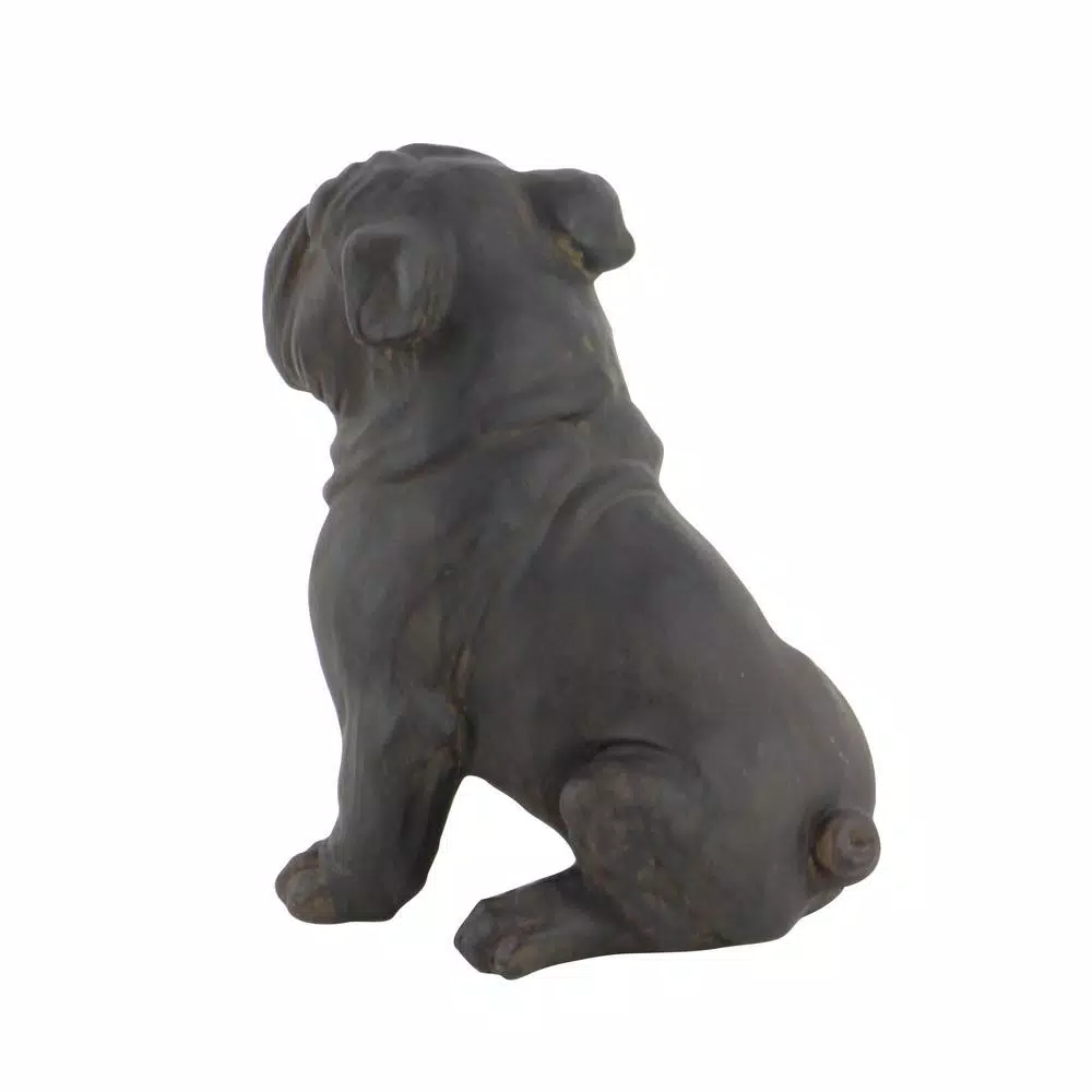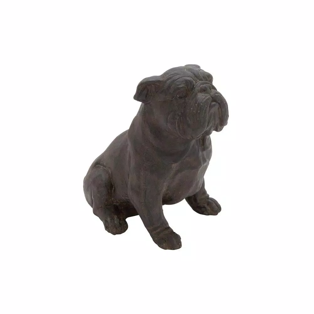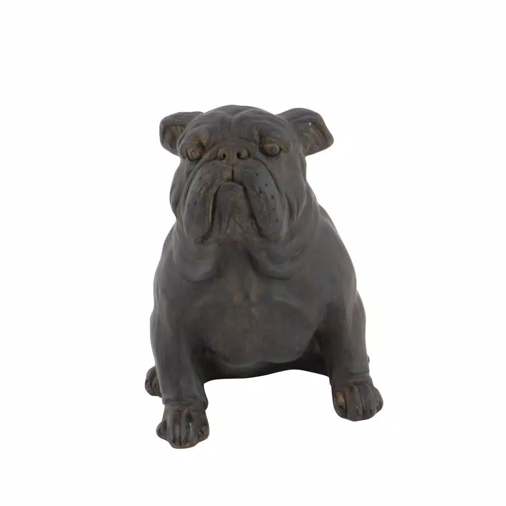 This carved bulldog decorative sculpture features a sitting bulldog figure made of natural stone and resin, with carved details for a natural look. The flat footed bulldog legs and bottom provide stability to this decorative sculpture. This sculpture’s textured brown finish adds a rough and rugged look that enhances its Old World charm.