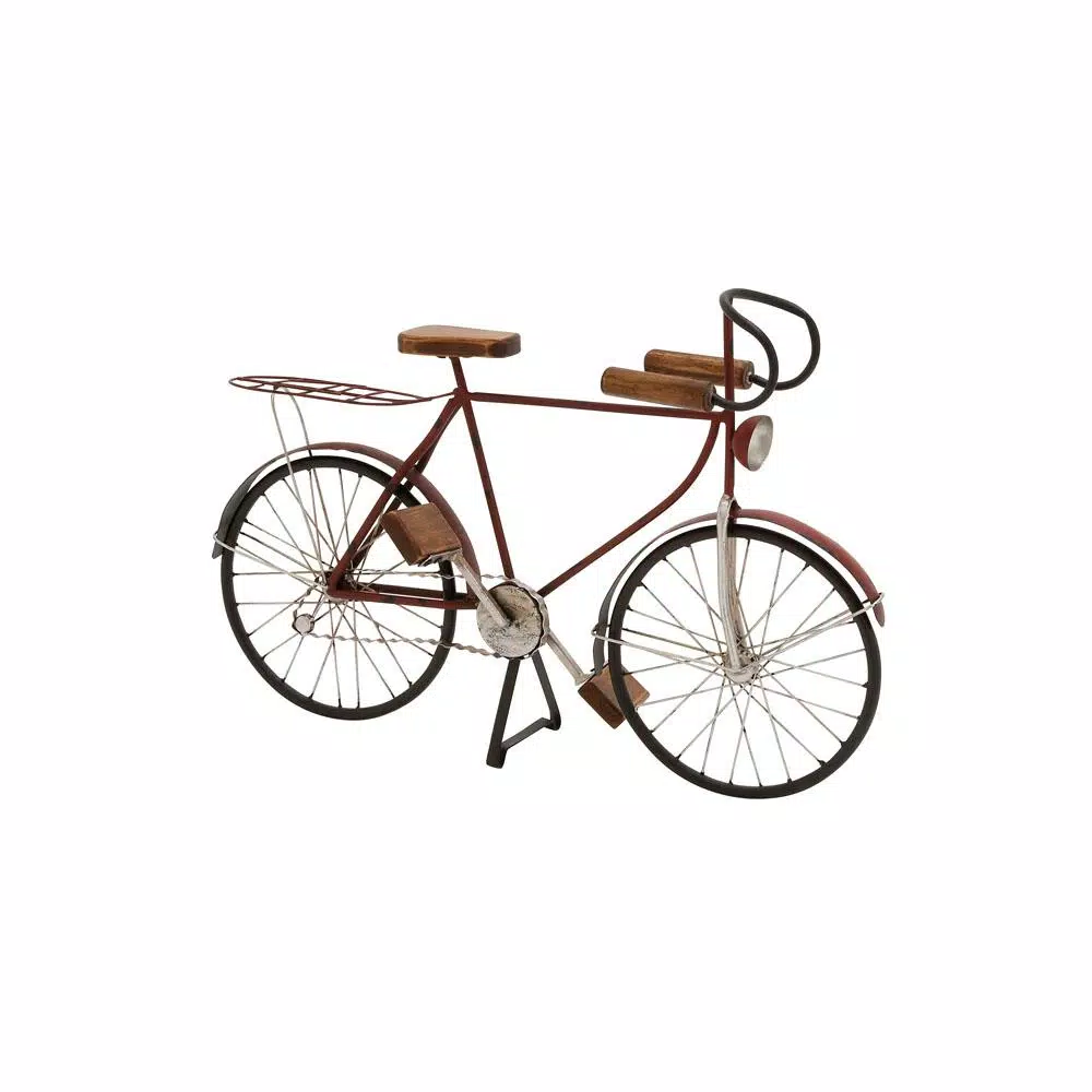 This bicycle decor features a detailed bicycle figure with made of iron with aspen wood seat, handlebars and pedals fit for adding personality to design settings. An iron band triangular stand keeps this bicycle model upright. The bicycle’s metallic black and gray iron and oak brown wood finishes create a rugged look that brings vintage vibes to homes and spaces.
