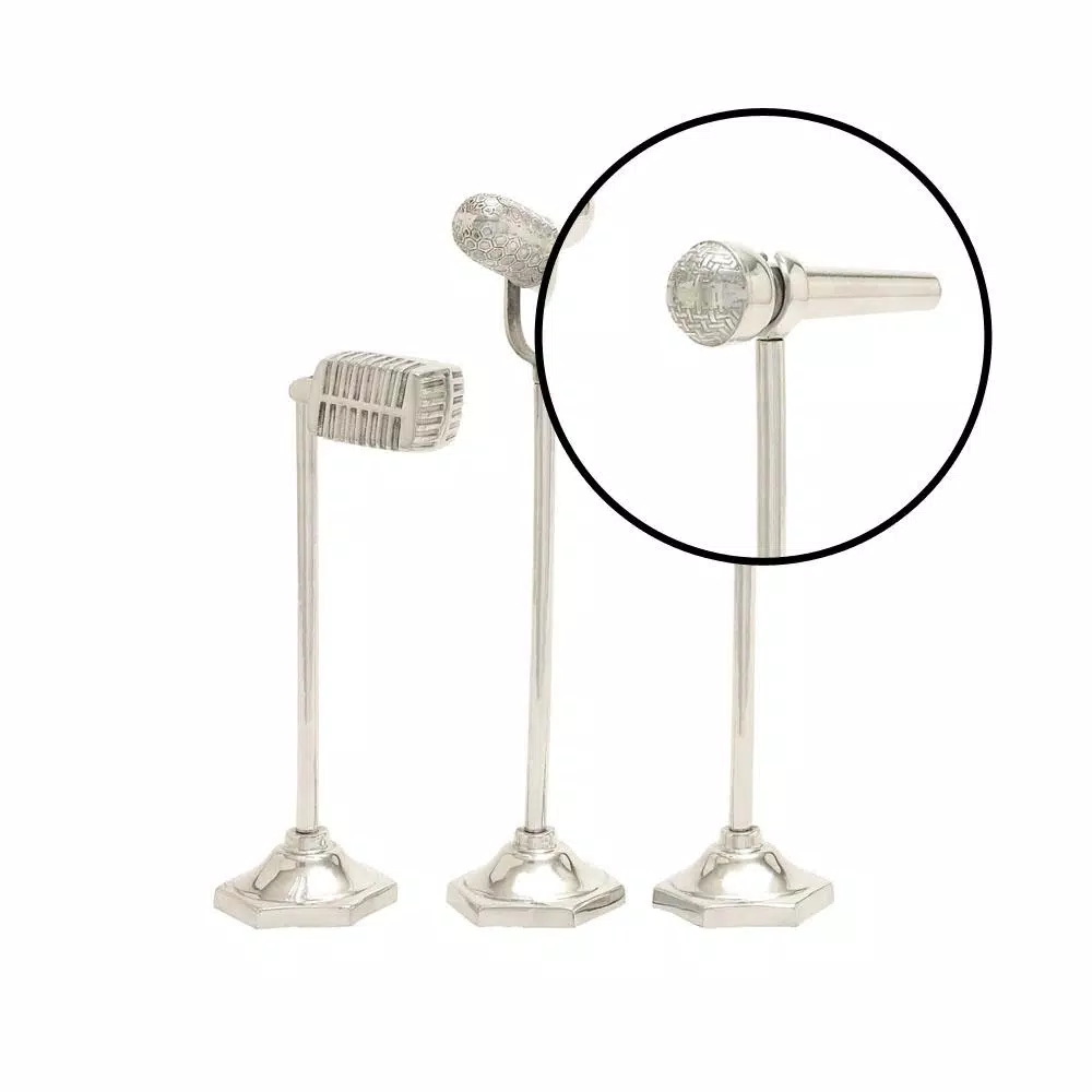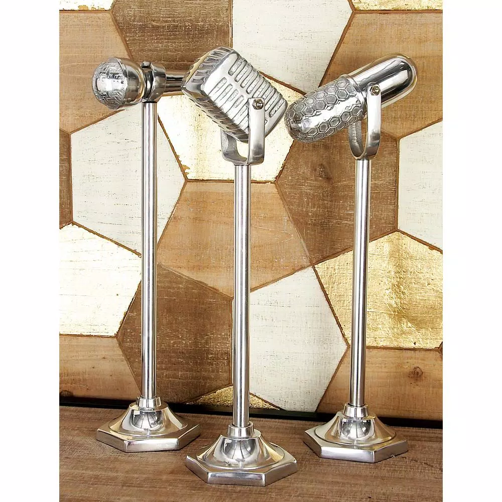 This set of 3 decorative sculptures features rectangular, capsule-shaped, and ball-tipped microphones on stands, mounted on hexagonal-shaped bases for stability. The vintage-style design of these model microphones adds personality to interior design themes. These decorative model microphones come in a polished silver aluminum finish that gives them a smooth and elegant look.