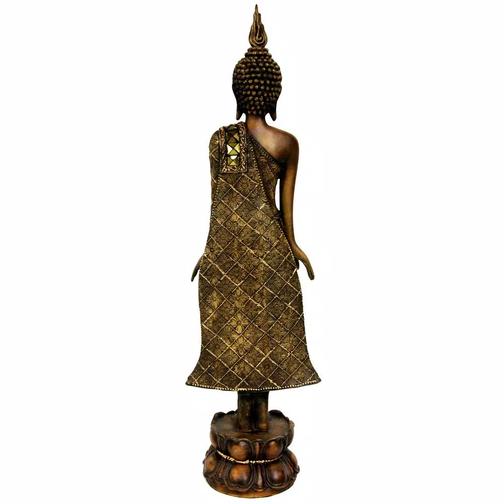 An elegant, beautiful rendering of “the awakened one” in classic Sukothai style robe and crown. The hands were carved in a lovely “welcome” mudra in the original temple design, welcoming supplicants to the temple refuge. At almost 2 ft. tall, this is one of the tallest Buddha statues available; commanding attention with its size and exceptional beauty. This is an outstanding resin casting, with outstandingly beautiful detail. The textured pattern of the fabric and the cut glass inlay, the flame top knot and sublime face, the delicate hands and feet, the classic lotus pediment base, all contribute to make this one of the finest pieces. Choose this Buddha statue for a dramatic decorative impact in any room.