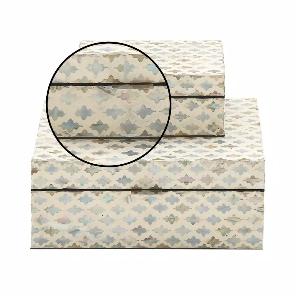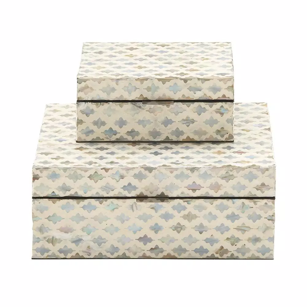 This set of 2 decorative boxes features rectangular MDF wood bodies with lids that offer convenient storage options for homes and living spaces. These boxes are decorated with beautiful mother of pearl tile inlays in tan, gray and blue over a vintage white background with lacquered zigzag pattern design, adding a soft touch of color to interior design themes. The simple design and muted colors of these decorative boxes make them excellent for shabby chic design settings.