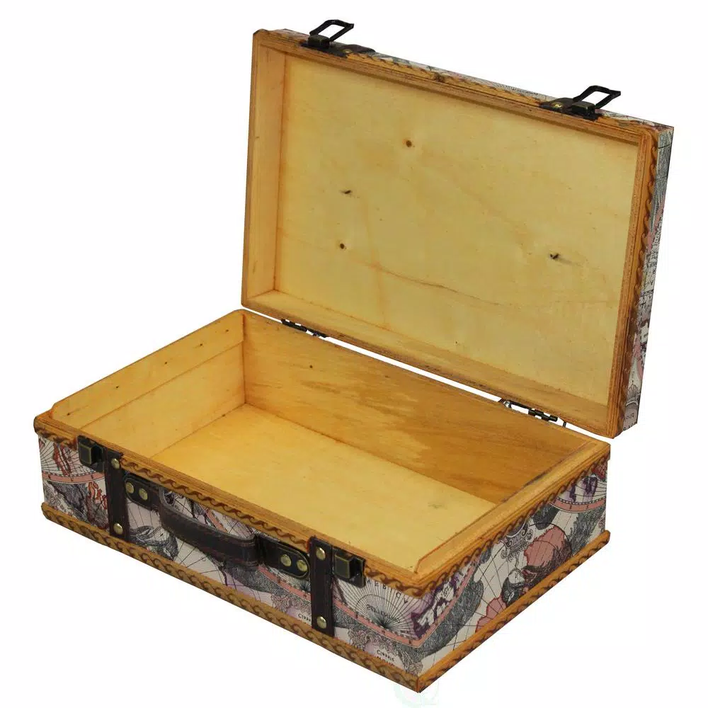 Vintiquewise Old World Map Suitcase is the perfect keepsake box for all your vacation mementos. The suitcase is covered faux leather with a map print, which adds to the overall nostalgic feel.