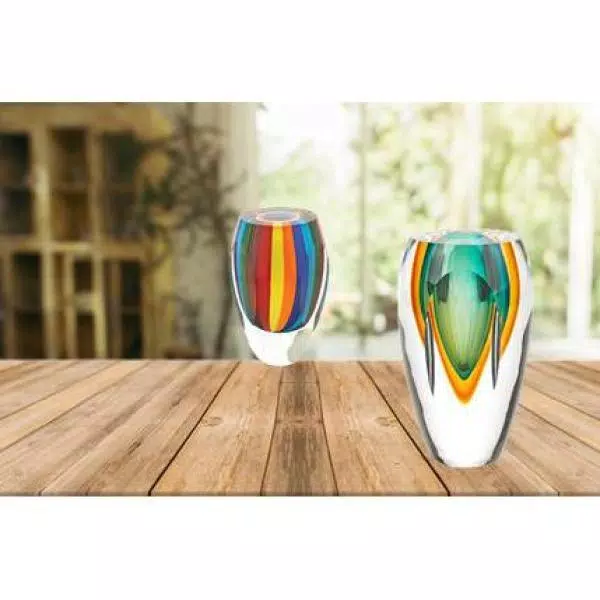Sturdy and gorgeous this lovely vase shows off its layers of rainbow colored glass colors proudly. A small yet powerful accent-Piece with great weight and pizazz. The rainbow is a comprised of seven different colors. Each of these colors is vibrant and beautiful and each one is different than the next. This conveys a beautiful message of inclusiveness and cohesion. It demonstrates how beautiful diversity can be. Art glass is a blend of many colors of glass and it is completely normal to have air bubbles appear in the glass. Colors may also vary slightly from-Piece to-Piece making each one a unique work of art.