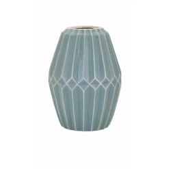A distinctive shape and a subtle turquoise glaze enhance the geometric detail of this medium stoneware vase. Great design updates the feel and tone of any room. Conveys artisan skill and quality craftsmanship. Makes a perfect addition to the curated home.