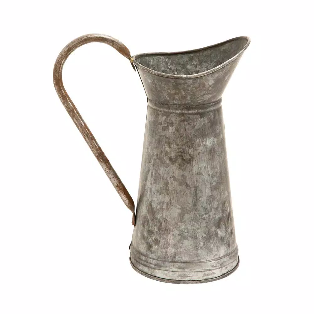This watering jug decor is designed with a round, tapered tin body. A flared top with a curved rim, a large, curved handle and a flat circular base for stability. Its hammered gray and rust brown finishes give this jug a rugged, timeworn look that brings rustic vibes to homes and living spaces. The classic design and weathered appearance of this watering jug decor make it an excellent decor for industrial and farmhouse style interior design themes.