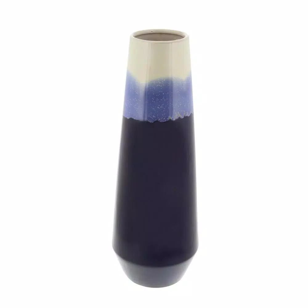 - 7″ x 20″ Modern Reflections ceramic blue vase, elongated tulip-shaped stoneware body with blue and white gradient color, glazed finish