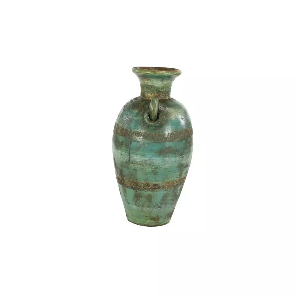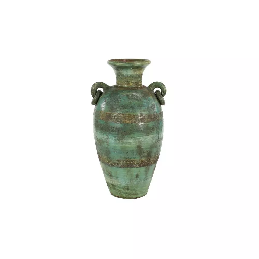 Hand-painted in horizontal earthy greens & natural light brown brushstrokes for a semi-glossy, textured stripe finish, this statuesque two-ring ceramic vase emanates decor you would find in a seaside Mediterranean home… Measuring 13″ x 23”, this handmade floor vase is multi-dimensional with layered glazing, earth tones, and unique adornments. Round at the top and tapered toward the bottom, the classic shape has added character with looped handles with ceramic O-rings, a tall neck, and fluted lip. Make a bold and colorful statement with this rustic decor!23″ x 13″ Rustic Distressed Multicolored Ceramic Amphora Vase, features a tapered body, comes with a narrow neck and a round opening, two small handles, flat, round base