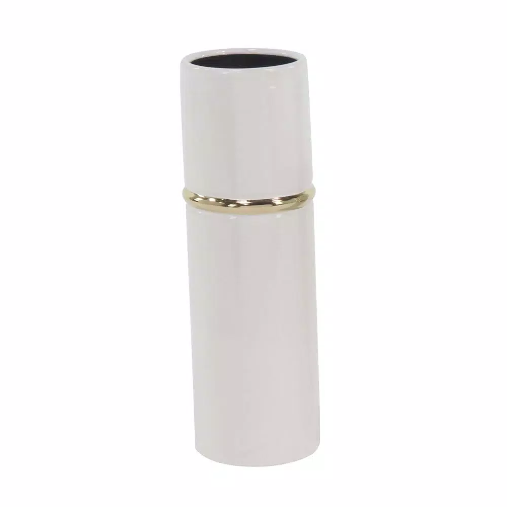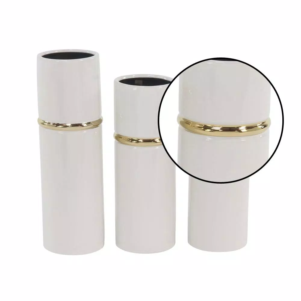 This set of 3 ceramic vases features a simple design with an off-center horizontal gold band detail that beautifully accentuates tables and shelves. Their white ceramic bodies come in a polished finish for a smooth and elegant look. These vases make great standalone pieces that can also be paired with a variety of decorative items.