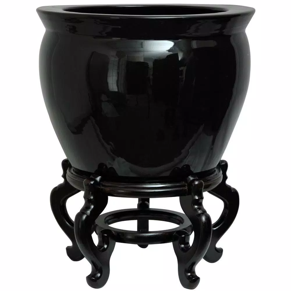 Chinese fishbowl jardiniere, sized for smaller house plants. Chinese fishbowl jardiniere, sized for fresh cut, silk, or dry flower arrangements. The bold, black monochrome glaze works beautifully with modern eclectic American interior design.