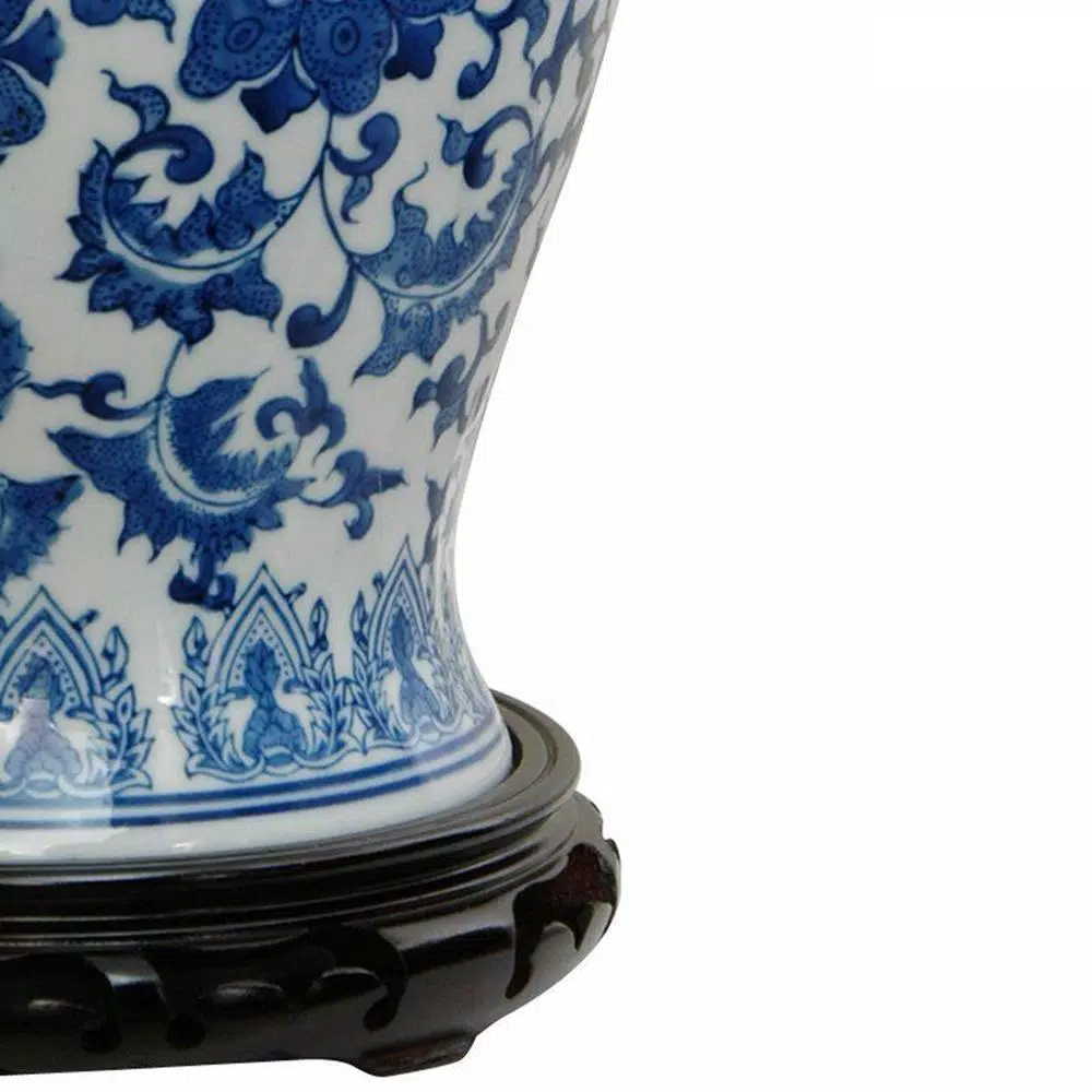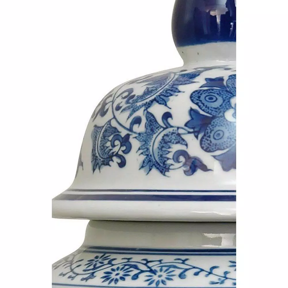 Large oriental porcelain temple jar with Ming Dynasty style vine and leaf design. Traditional blue and white colors are coated in an antiqued ice crackle glaze. Display in matched pairs on a hearth, breakfront, credenza, or alone on a pedestals or plant stand. The lids are removable, great for storing collections of small objects.
