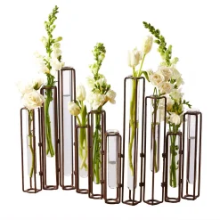 Two’s Company 13 In. High Lavoisier Set Of 10 Dark Brown Hinged Flower Vases With Antiqued Rusted Finish And Clear Glass Tubes