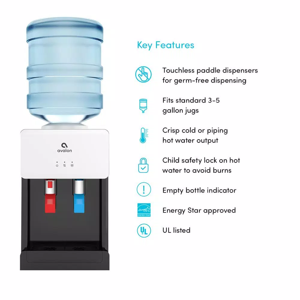 - Innovative and stylish design: Avalons countertop top loading water cooler dispenser features a slim design that won’t look bulky, even in small spaces, and fits on any tabletop